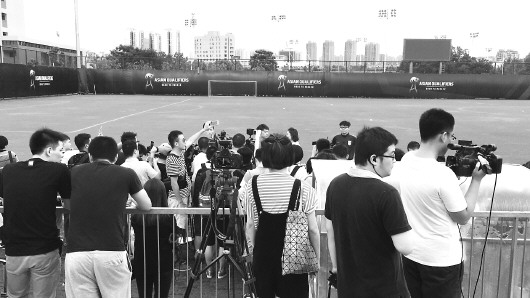 国足抵达武汉的前几天,因为2017年全运会的举行,在塔子湖武汉足协基地的训练少有人问津,即便有记者前往观看训练,也不过寥寥数人而已。而29日18:00进行的只开放15分钟的训练,塔子湖足球基地的1号场内竟然云集了近百名记者,其中不少人还是从天津全运赛场专程赶来的。