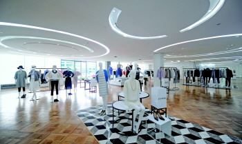 走进这栋建筑,一楼是挑高的中庭,上书“1972年”字样的基石耸立在中央,象征着如意发展的起点。中庭两侧轮转播放的SMCP、瑞纳公司旗下品牌宣传片,还有一个个展厅,让人近距离看到如意旗下这些奢侈品牌的成衣展品。