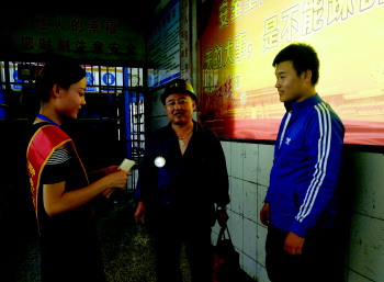 在工作人员的带领下,志愿者走进矿场参观工作人员的工作环境以及工作硬件设施。此外,志愿者运用宣传手册以《煤矿安全规程》为依据,多角度地从开采、防治水和防灭火、爆炸材料和井下爆破、设备检修等方面通过法律明文规定为工作人员进行普法宣传,希望他们在合法权益被侵犯时学会运用法律武器维护自己的合法权益。活动最后,志愿者跟随工作人员来到矿井入口,了解井下应急训练,学习入井的严格章程,真正体验工作人员的工作场景。