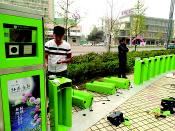 29日上午9时许,齐鲁晚报记者在菏泽市区丹阳路与人民路交叉口东南角小广场看到,施工人员正在冒雨安装公共自行车车桩,崭新的车桩弧行排列煞是美观。“车桩安装好后,紧接着进行设备调试,调试完成即可投入使用。”现场一名工作人员介绍说。