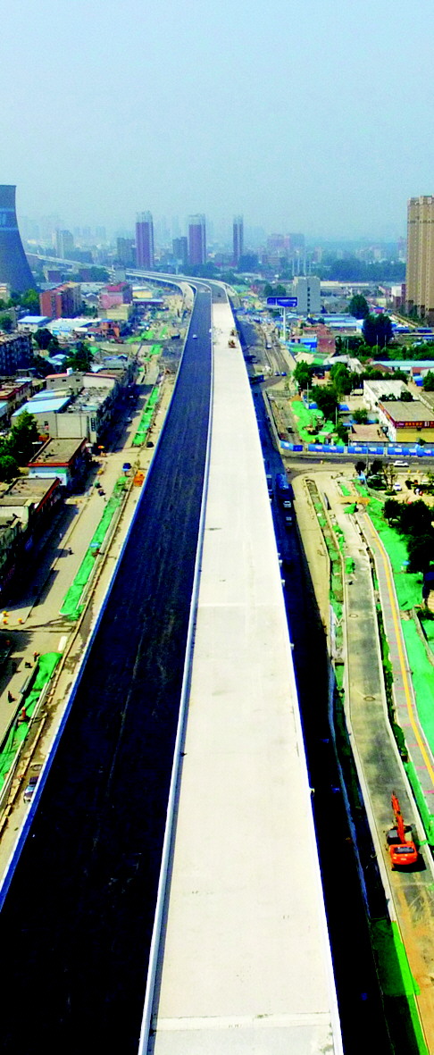 近日,全福立交桥至奥体中路之间的工业北路高架主体全部建成,桥面第一层沥青由西向东摊铺,已经铺设到幸福柳广场附近。高架桥下快车道沥青层也已铺设到位,开始进入辅道和人行道地砖铺设阶段,部分路段恢复双线6车道通行。按照计划,工业北路高架将在今年11月底通车。