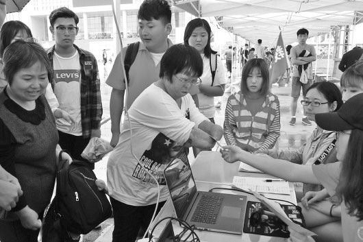 9月10日,正式报到日,在刘洁办理报到手续时,其他学生发现了刘洁的特殊,纷纷围拢过来。看到刘洁娴熟地用双臂接过笔俯下身签名,人群中发出轻微但持久的惊叹声。当大家看到签名表格上一长串的名字中刘洁的签名格外规整时,纷纷拿出手机拍摄。刘洁对此并不排斥,微笑着向众人挥了一下臂膀,转身跟随志愿者到邻桌缴纳学费。