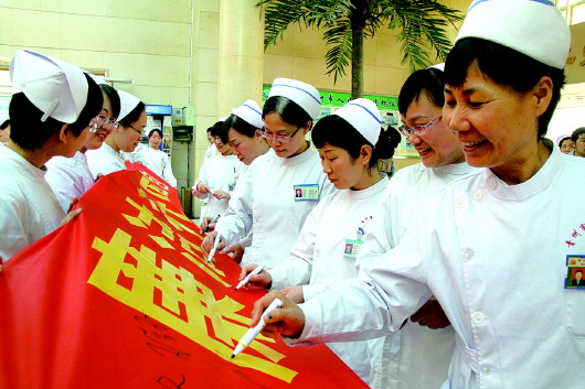 图为医护人员在“廉洁行医 拒收红包”横幅上签字