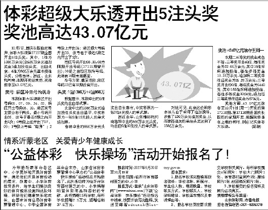 奖池方面,43.07亿元滚存至10月9日(周一)开奖的第17118期。第17118期是国庆长假后的首期开奖,提醒购彩者在上班的同时,别忘记买体彩大乐透。 (陈敏)