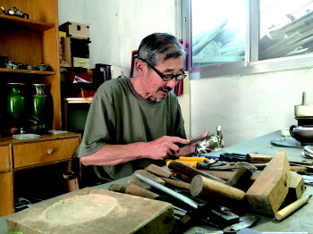 走进谷祖威工作室,桌上摆满工具、未完成的锡镶作品、各式锡片图案。“双龙戏珠”、“松鹤延年”,栩栩如生,传神逼真。在这个不大的屋子内还摆了一个柜子,摆满了各种成品锡镶壶、锡镶盘、茶碗。