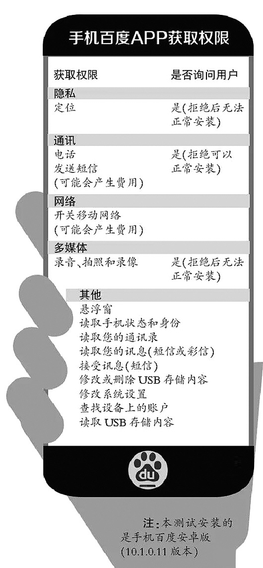 记者用另一部安卓手机下载手机百度APP后,安全检测软件提示,安装该应用,需获得“定位,电话,发送短信,开关移动网络,录音、拍照和录像,悬浮窗,读取手机状态和身份,读取通讯录,读取讯息,接受讯息,修改或删除USB存储设备中的内容,修改系统设置,查找设备上的账户以及读取USB存储设备中的内容”共计15个权限,点击安装后,发现三个权限申请,分别是允许手机百度使用电话、允许使用此设备的位置信息、允许访问设备上的照片、媒体内容和文件。
