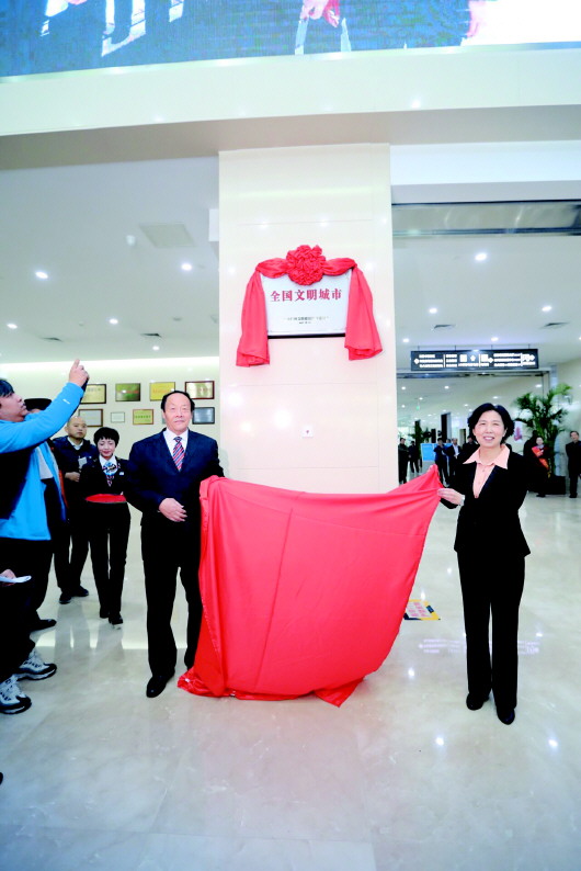 2017年11月22日,济南市民巡访团团长辛安与裕园社区居委会主任刘云香一起为文明城市牌匾揭牌。 (资料片) 本报记者 刘雅菲 摄