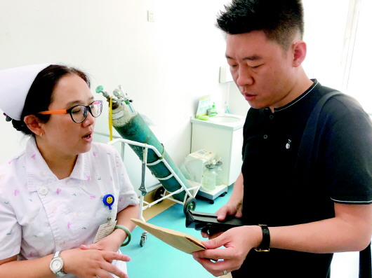 16日上午,在省中医,济南市民朱先生(右)提前来为儿子买三伏贴。