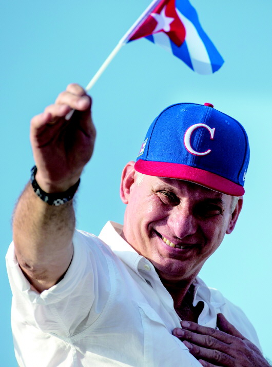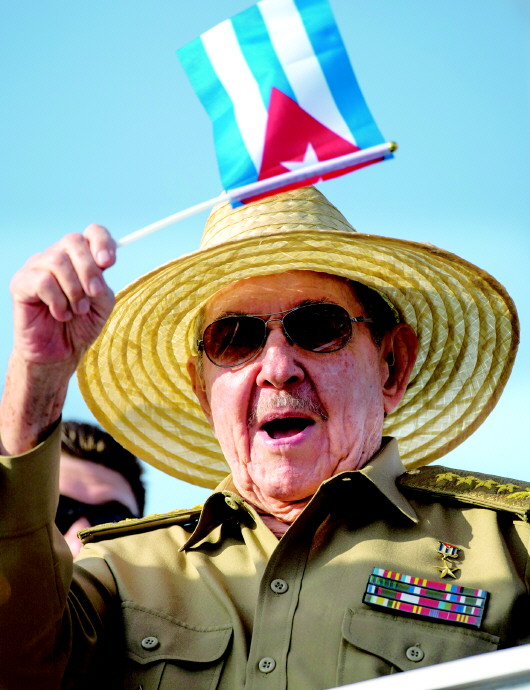 今年5月1日,在古巴哈瓦那,古巴新任国务委员会主席迪亚斯-卡内尔(左)、古共中央第一书记劳尔·卡斯特罗(右)参加“五一”集会游行。 新华/美联