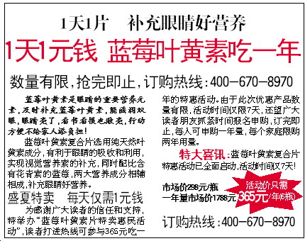 为感谢广大读者的信任和支持,特举办“蓝莓叶黄素片特卖惠民活动”,读者打进热线可参与365元吃一年的特惠活动。由于此次优惠产品数量有限,活动时间仅限7天,还望广大读者朋友抓紧时间报名申购,订完即止,每人可申购一年量,每个家庭限购两年用量。