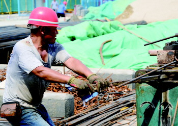 ◤一名钢筋工手上戴着厚厚的胶皮手套,防止手被晒热的钢筋烫伤。