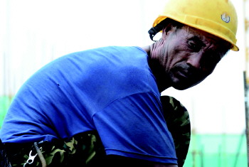 距钢筋架20米处,一位工人正进行钢筋条的对焊。50岁的吴师傅是位老技术工,已经从事建筑施工多年,他说自己一天可以焊接400多根钢筋条。“一天到头离不开水,每天至少要喝10斤。”