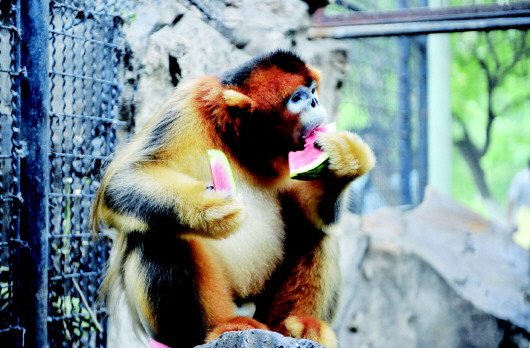 ◤金丝猴吃着西瓜,快乐消暑!