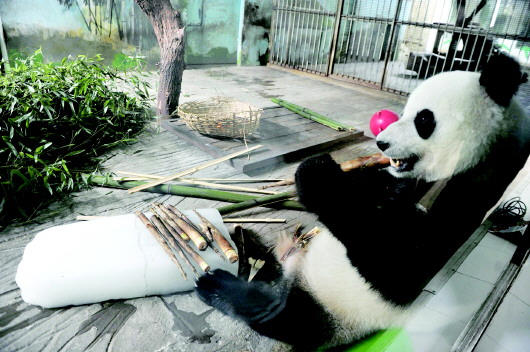 ▲抱着冰块,吃着美食,大熊猫好不惬意!