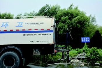 环卫部门的洒水车正在灌装中水。 本报记者 孙璇 摄