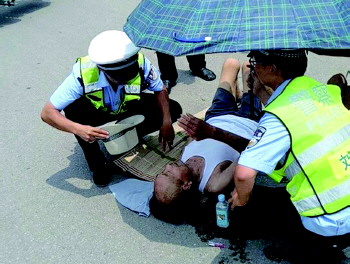 执勤民警马上拨打了120急救电话,又迅速为老人买了纯净水,并借了一把遮阳伞,为其遮阳、扇扇子降温。同时,热心群众喂老人喝水,给老人往额头撒水降温。