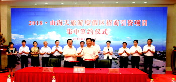 其中,重庆德杰集团与山海天旅游度假区管委签署的中华国医坛国际养生城项目,由重庆德杰控股集团、德润集团、兴海建设公司共同投资建设,项目计划总投资约358亿元,总用地面积约17200亩。一期工程计划总投资约167亿元,用地面积约3560亩,选址位于卧龙山东、秀水河两岸。定位于打造以中医药养生产业为主,集旅游观光、会议、展销、科研、博览、健康管理、茶文化、古城遗址、休闲运动于一体的综合性主题园区。