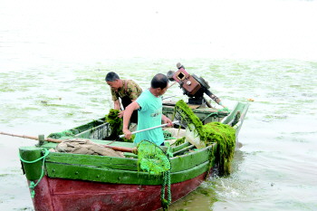 浒苔来袭 来源:齐鲁晚报 2018年07月18日 浒苔来袭 日前,荣成石岛湾海域出现浒苔,石岛区海洋浒苔处置应急指挥部立即启动应急响应,指挥组织出海打捞860船次、360人次,打捞浒苔千余吨。 本报记者 王震 通讯员 李法科 周圆美 摄影报道 本稿件所含文字、图片和音视频资料,版权均属齐鲁晚报所有,任何媒体、网站或个人未经授权不得转载,违者将依法追究责任。