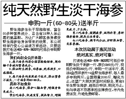 打进电话400-878-5622即可低价申购野生淡干刺参一斤。原价3960元/斤,现低价申购999元/斤,申购一斤送半斤,再送4盒西洋参片+4盒野生海参籽,每人最多申购两斤。全国限量2000斤,赠完为止。还望广大朋友抓紧时间报名,更有8年生野生海参,超低价特供,购完为止。如与承诺不符愿承担法律责任。市内免费送货,外地免费邮寄。