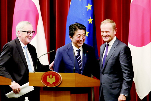 ◥7月17日,在日本东京,日本首相安倍晋三(中)与欧洲理事会主席图斯克(右)及欧盟委员会主席容克出席联合记者会。 新华/路透
