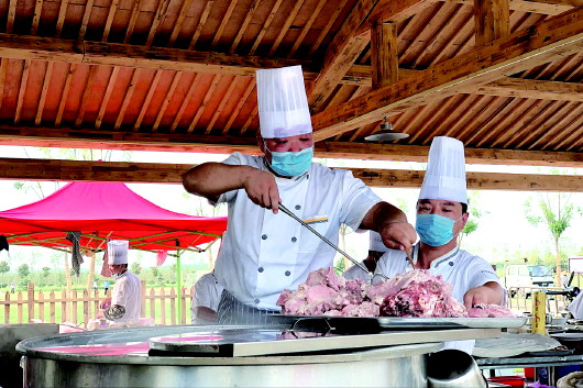 伏羊节以肉为主,活动现场,祥和庄园生态餐厅厨师长李辉带领他的团队,一起为慕名前来的游客准备了丰盛的全羊宴,现场座无虚席。新鲜的羊肉加上大厨们的精心烹饪,每一道菜都让游客们赞不绝口。从外地赶来的李女士说:“知道有这样的活动便来了,羊肉汤真的很好喝,又鲜又香。”据李辉介绍,本次伏羊宴共准备了20天左右的时间,准备了200多只爬山羊。