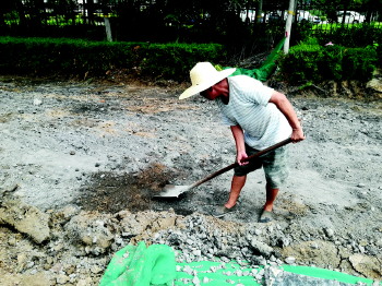 记者看到这里原来的路面已经被挖开,挖掘机挖开后,路面上散落着很多石子石块,道路凹凸不平,王业广和工友们拿着铁锨在清理路面。他穿着一双布鞋,布满了泥土。闷热的天气下,9点多外面的温度就达到了35度, 记者刚拿出温度计时,上面的温度显示为32℃,没过多久,温度就到了35度,在户外站着的记者即使什么都不做也汗如雨下,更别说正在劳动的工人们。王业广汗流浃背,在灼人的热浪下,豆大的汗珠不断地从他的额头、脸颊滚落,衣服已经完全被汗水湿透。