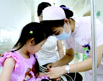 市立医院的儿科病房里,增设在走廊里的病床已经排满,仍有患儿不断前来就诊。“到8月中旬前后,患手足口病的孩子会更多,别说要床了,坐座位都得排队。”儿科主任刘学工指着墙上的一排挂钩说,“到时候都得在这里坐着挂吊瓶。”