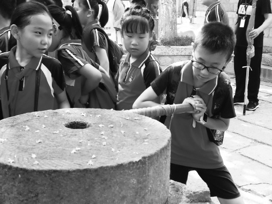 在泉水豆腐博物馆,学生争相体验当年制作豆腐的石磨盘