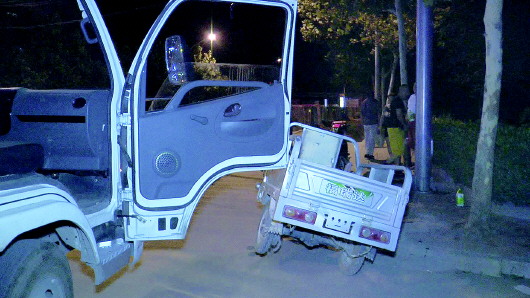 7月21日晚,市民张先生路过现场时,伤者已经送往医院。在马路南侧路边,一辆箱式小货车头东尾西地停在那里。其右边,一辆电动三轮车被小货车的右门顶在车厢上,左轮翘起。