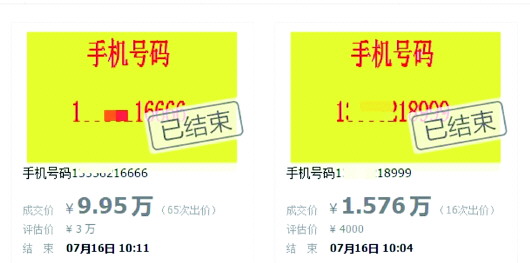 经多次竞拍,尾号“6666”的靓号拍出9.95万元的高价,尾号“8999”的靓号拍出1.576万元,均超出起拍价数倍。