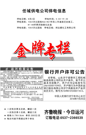 ●鱼台县昇泰日用品商行税务登记证副本税号37082819700709003301,营业执照副本注册号370827600250155,声明作废。●嘉祥县嘉祥镇喜迎门糖果门市部公章不慎丢失,编号3708290006529,声明作废。