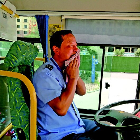 随着气温的升高,走了不到3站路,郅爱军的后背已经湿透了。遇到路口等红灯时,他赶紧拿毛巾擦一擦脸上的汗。“中午头里,脸上的汗就没有断过,有时流到眼睛里,开着车也不太方便擦,只有等红灯的时候,赶紧擦擦。”郅爱军说道。