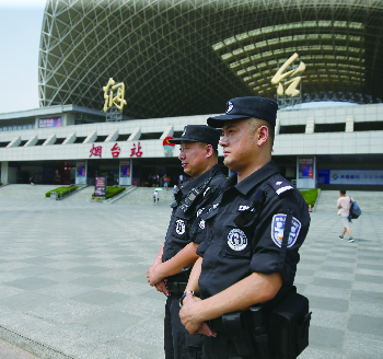 芝罘特警张伟、刘新伟(自右向左)在火车站执勤。