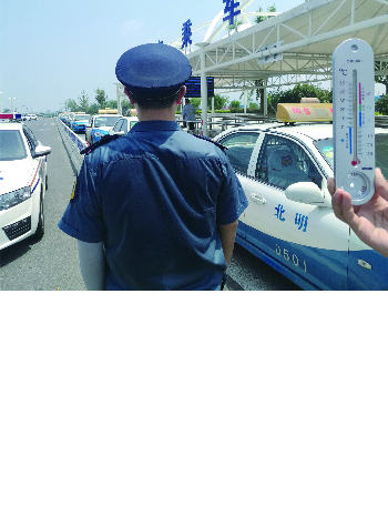 25日中午,烟台城铁南站广场地表温度达到40℃以上,市交通运输管理处城铁南站客运管理所的十名工作人员依然顶着烈日,不间断地对待租车辆进行监督检查。脸上汗流如注,后背的衣服也被全部打湿……在烟台火车站,芝罘公安分局特警一站就是两小时。