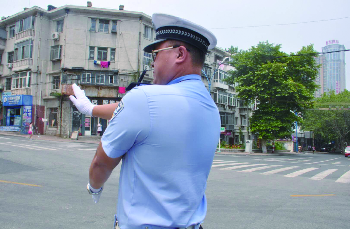 交警一大队机动中队民警孙涛在文化路路口执勤。