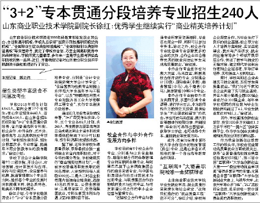 山东商业职业技术学院是1999年经教育部批准设立的公办、全日制高职院校。学校先后获得“国家示范性高职院校优秀院校”、“全国毕业生就业典型经验高校”、“全国创新创业典型经验高校”等荣誉称号,奠定了学校在全省、乃至全国高职教育中的品牌地位。学校师资力量雄厚,多年来一直是学生报考我省高职院校的第一选择。近日,齐鲁晚报记者对山东商业职业技术学院副院长徐红教授进行了采访。