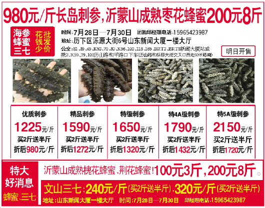 980元/斤长岛刺参,沂蒙山成熟枣花蜂蜜200元8斤