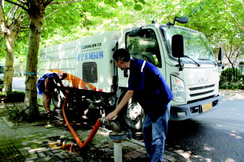 环卫人员正为扫水车加注中水。