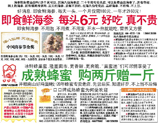 凭本版,购即食鲜海参240元,老淡干海参600元,优惠后,再赠送价值22元的口口牌蜂胶皂一块。