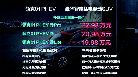 此次上市的领克01 PHEV共有3款车型,市场指导价为领克01 PHEV劲Pro 26.28万元;领克01 PHEV劲24.28万元;领克01 PHEV劲Lite 23.28万元。领克01 PHEV将采用全国统一补贴方式,统一最高补贴额度为33000元(国家补贴+地方补贴目前最大值),补贴后价格为领克01 PHEV劲Pro 22.98万元;领克01 PHEV 劲20.98万元;领克01 PHEV劲Lite 19.98万元。