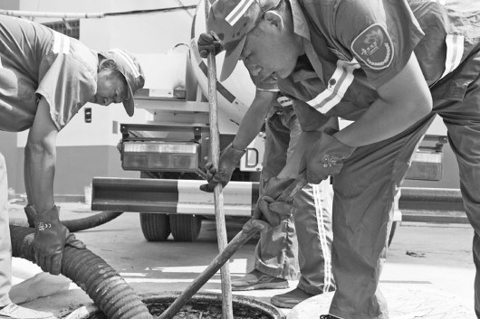 “刘师傅,你们怎么不戴个口罩啊?”“这气味我们早就习惯了,闻不到了。”刘师傅乐呵呵地说道,像个没事人一样继续干活。吸污车上有一根黑色的直径约13公分的管子,又粗又重,刘荫钢双手抬着这根管子慢慢深入到化粪池内,随后,回到车上发动抽粪开关。同时,其他工友则拿粪勺、取粪叉,随着机器轰鸣声,不断地手动搅拌化粪池。“别看井口小,但下面池子又深又大,光靠管子吸不行,还得人工用勺子、叉子把粪便往管口这里送。”刘荫钢一边工作,一边向记者介绍道:“化粪池里有很多块状的垃圾,一不小心就会堵塞管子,所以要不停地搅动。”
