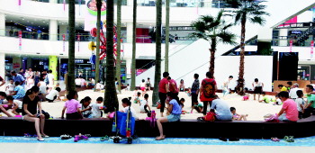 ◤淄博高新区一处大型商场内,不少家长带孩子来纳凉玩耍。 本报记者 胡泉 摄