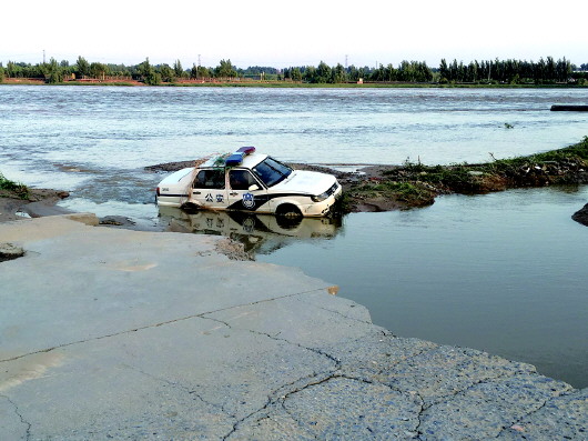 落水警车就停留距岸边5米左右的位置,小半个车身仍淹没在水中,一旁的路段均发生垮塌。据李维东介绍,此处距离落水点不足一公里。而在事发时,洪水没过了车辆停放的位置,还向岸边延伸了达40米。“如果不是水位下降,根本不可能看到警车。”