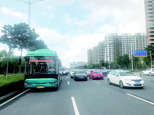随后,双方开始通行效率大比拼。首先是模拟在有公交专用车道的情况下,小汽车与公交车分道行驶。实验路段北起文苑街,南到敬德街红绿灯。公交车走专用道,小汽车排成三排,同时发车,通过红绿灯后,以公交车尾部和小汽车最后一辆车完全通过反光锥后停止。一路上,公交车遥遥领先。现场测量数据为:小汽车耗时8分10秒,公交车耗时5分10秒。