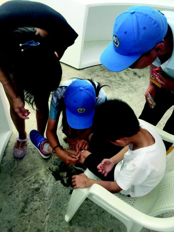 咨询台志愿者为受伤小朋友处理伤口。