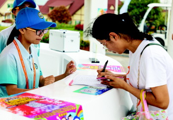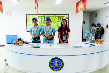 金沙滩啤酒城游客服务中心的志愿者。