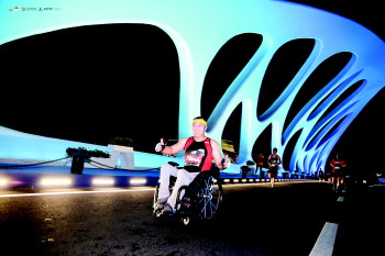 一名选手坐着轮椅也要参与到比赛当中。