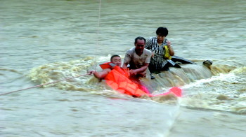 19日13时22分,日照五莲县许孟镇一辆黑色面包车在经过一座被洪水淹没的桥梁时,由于洪水水流湍急,致使车辆被冲到河中央,造成车内夫妻二人被困。