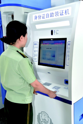 另一台身份证自助领证机类似于银行自助取款机。待市民的身份证办理好后,民警会将身份证放入机器内,市民前来领取时在屏幕键盘上输入本人身份证号码,系统自动与存证记录进行比对,查找证件。证件找到后,进行左、右手拇指指纹比对,确保人证的一致性。比对成功后,自助领证机将证件送到出证口,完成领取。