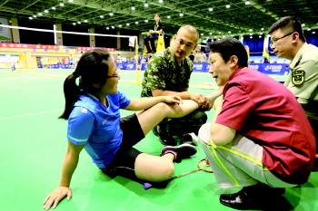 赛场上,运动员受伤后还要坚持上场比赛,裁判员在场抚慰受伤选手。